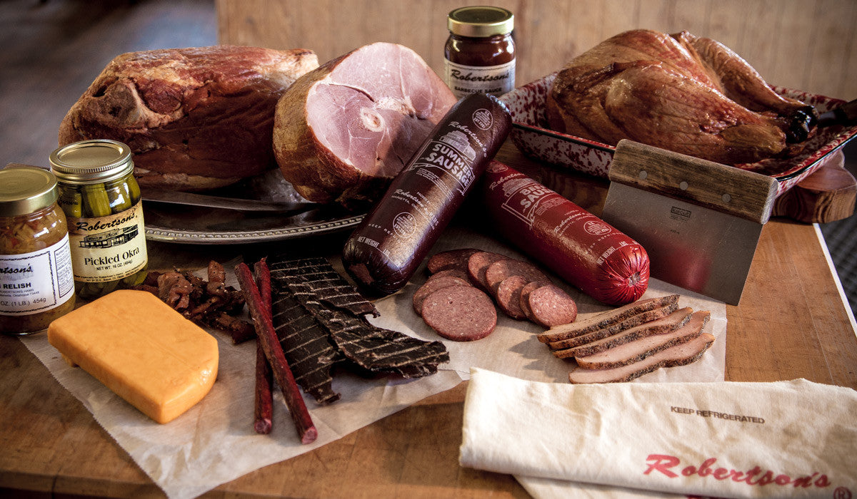 The small frontier stores in Oklahoma and Texas have been a decades-long popular stopover for hungry travelers, but the heart of the trade - smoked hams, beef jerky, and other smoked meats - has not changed much since Robertson began smoking meats as his father had done in the early 1900s. "The ham is smoked the old-fashioned way. We don't hurry it - we just slow-smoke it."